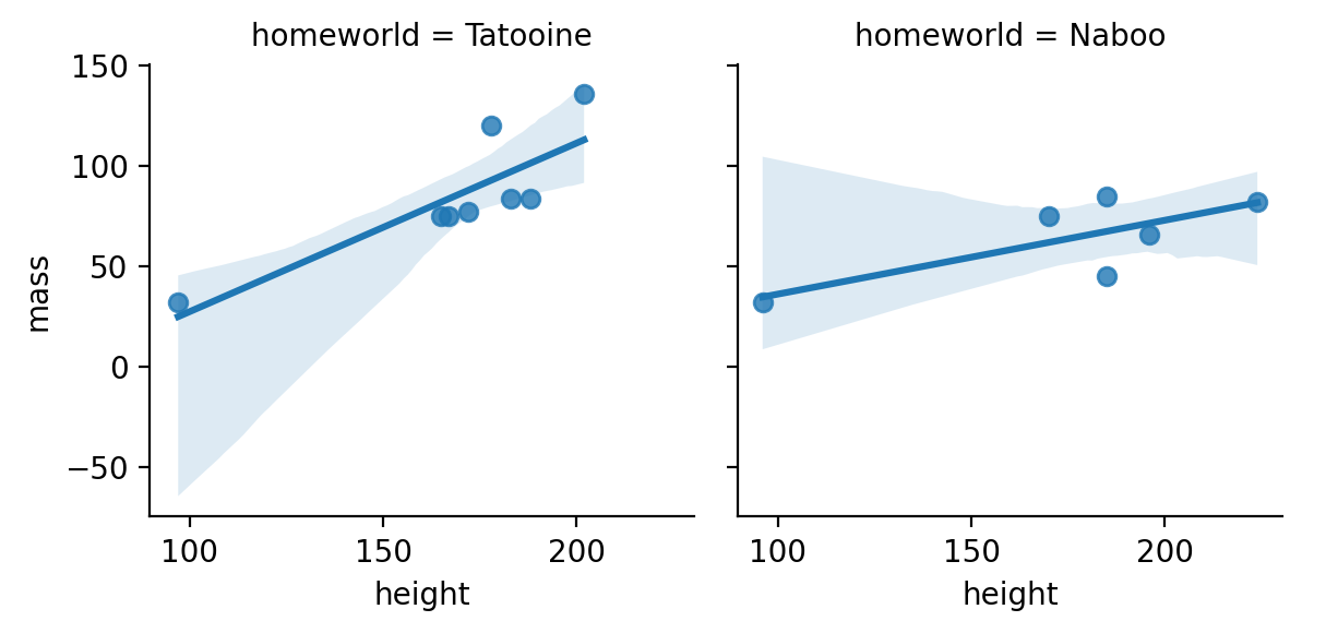 Create a facet-grid of 2 scatter plots between height and mass separately for Tatooine and Naboo