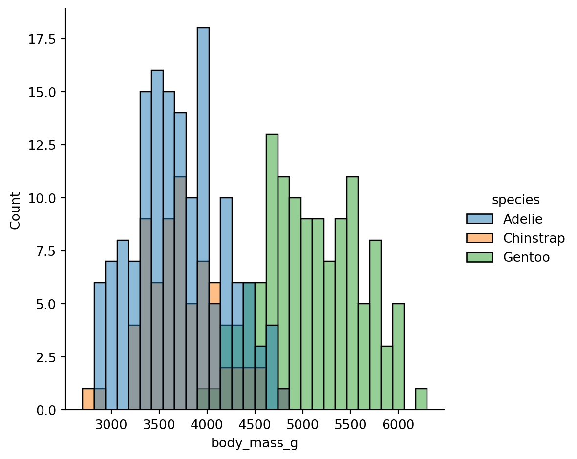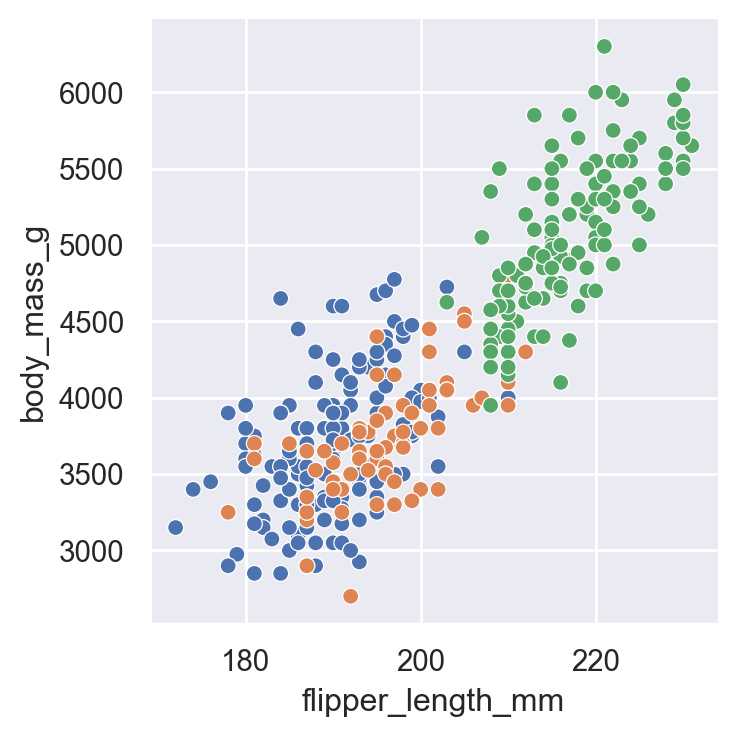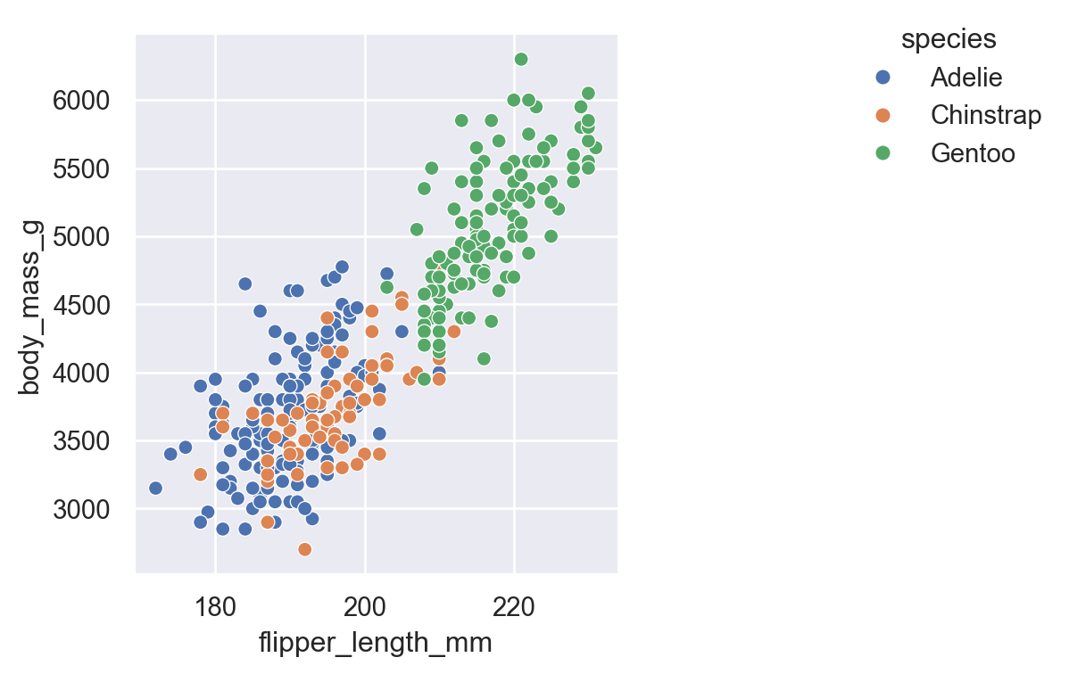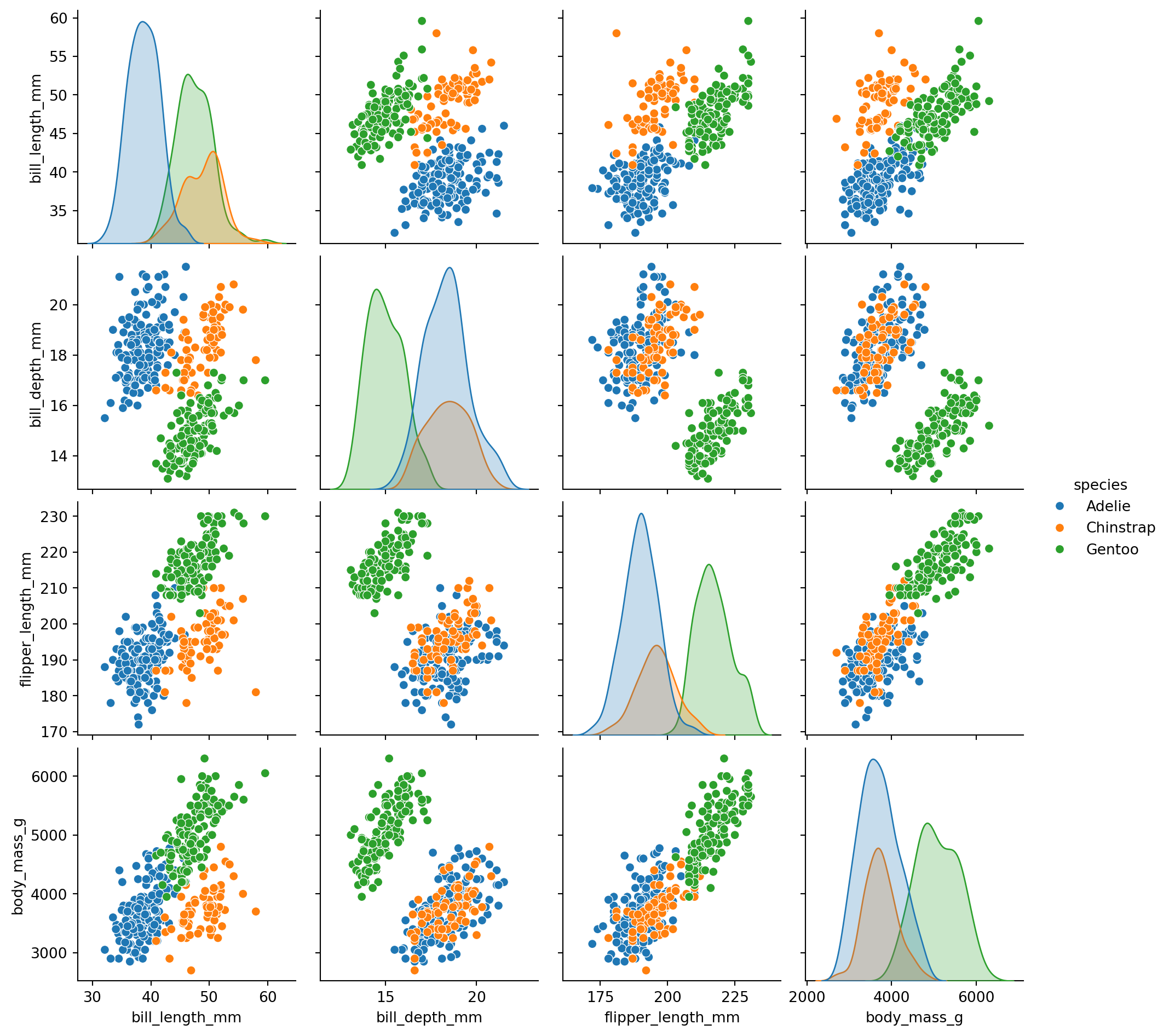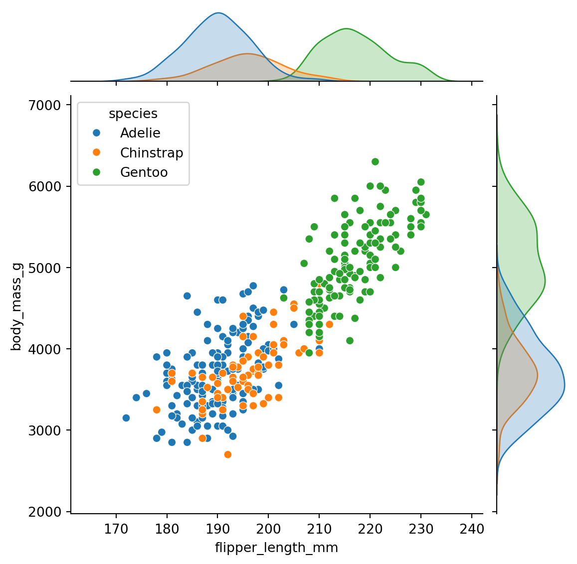 Now we can see that Gentoo penguins (green) are generally larger than Adelie (blue) and Chinstrap (orange).