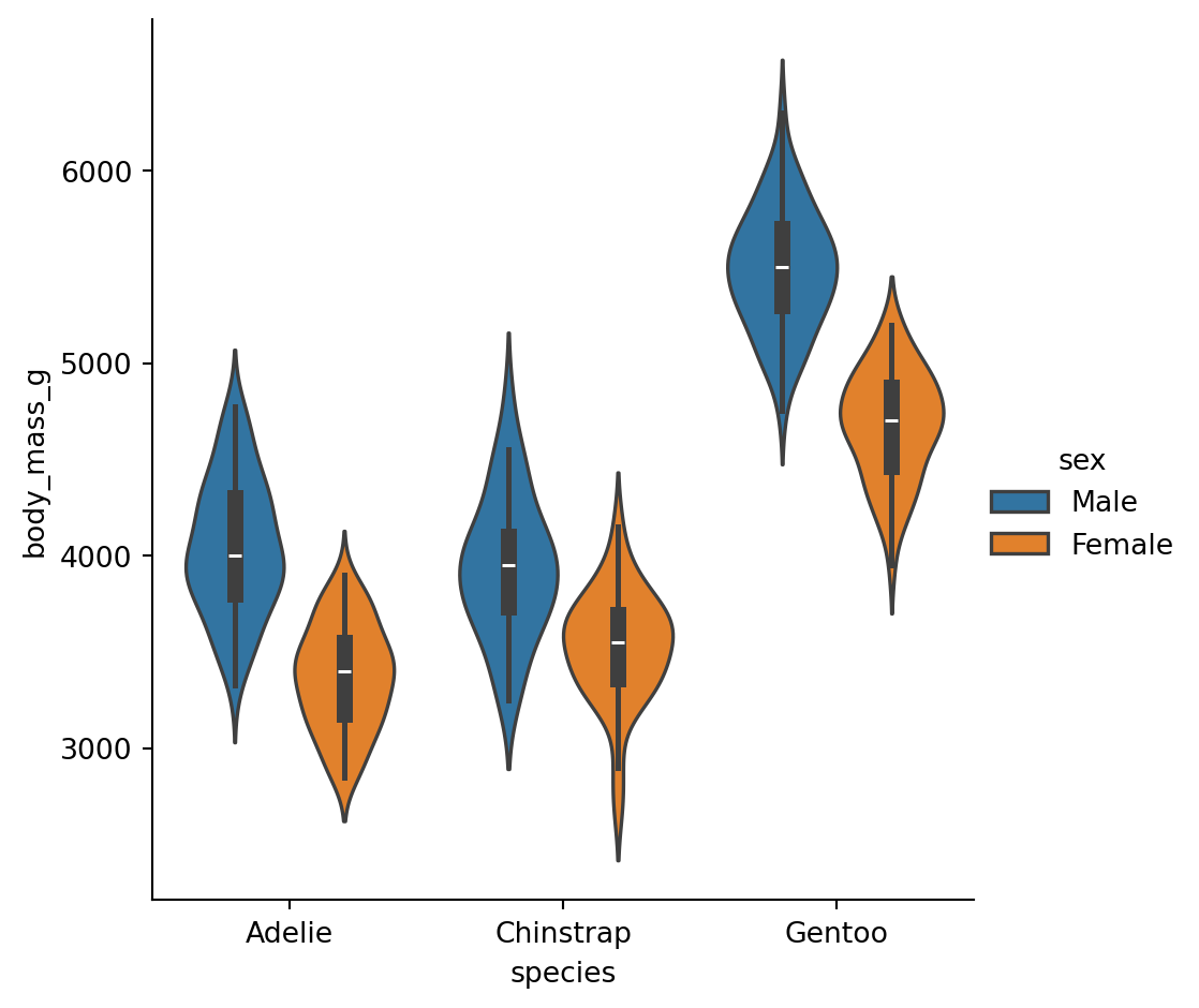 Violin plots combine a box plot with a KDE, showing the full distribution shape: