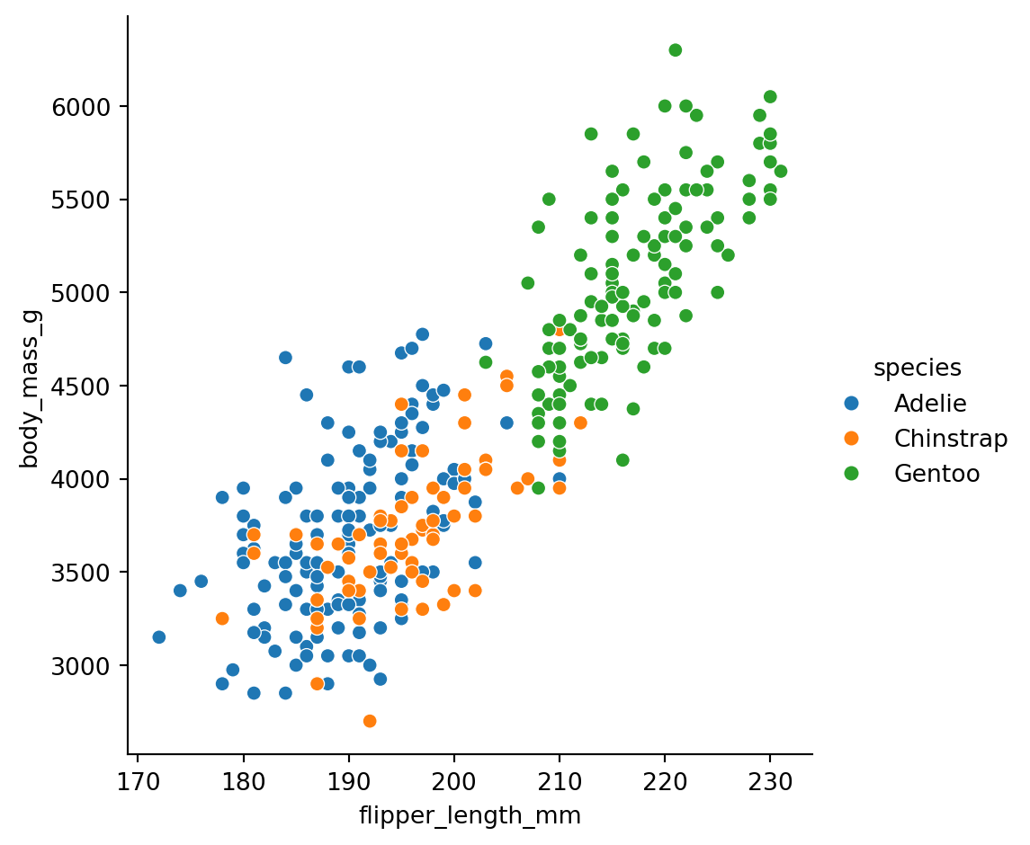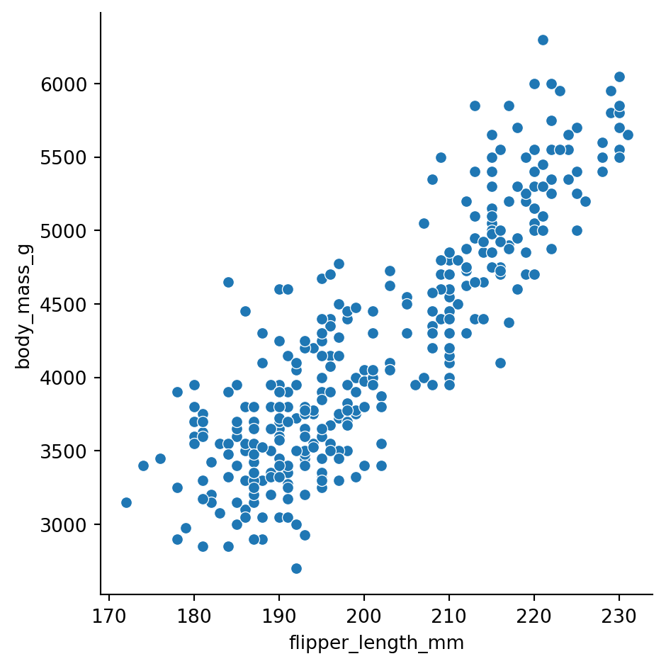 relplot()Use sns.relplot() when you want to see how numeric variables relate to each other. Let’s explore the relationship between flipper length and body mass in penguins: