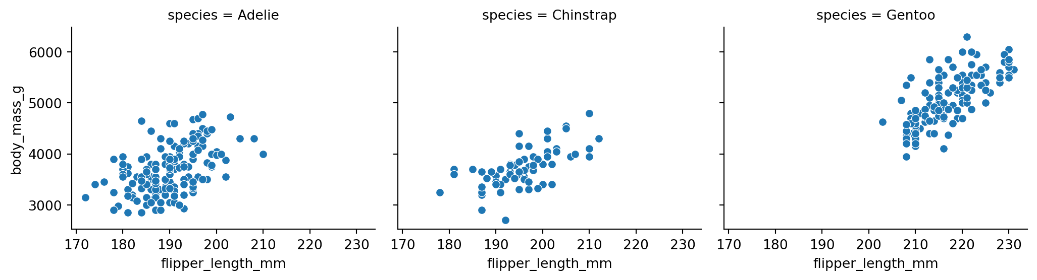 Each function accepts the same mappings (along with some data) using and returns a FacetGrid - a container that can hold one or more subplots.